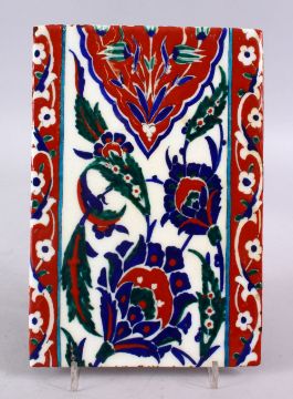 AN UNUSUAL RARE IZNIK POTTERY TILE, with decoration of floral motifs, 24cm x 16cm