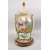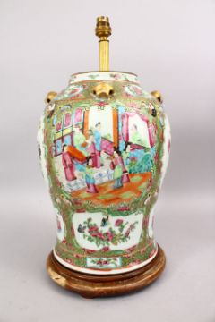 A LARGE 19TH CENTURY CHINESE CANTON FAMILLE ROSE PORCELAIN TEMPLE JAR / VASE, the body with panel decoration depicting figures, birds, butterflies and flora, with further formal scroll decoration, quad moulded gilt handles, mounted to a wooden base with lamp fittings, 40cm