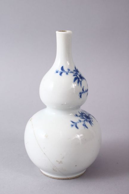 A CHINESE BLUE & WHITE PORCELAIN DOUBLE GOURD SHAPED VASE, (af) , the base with a six character kangxi, 14cm.