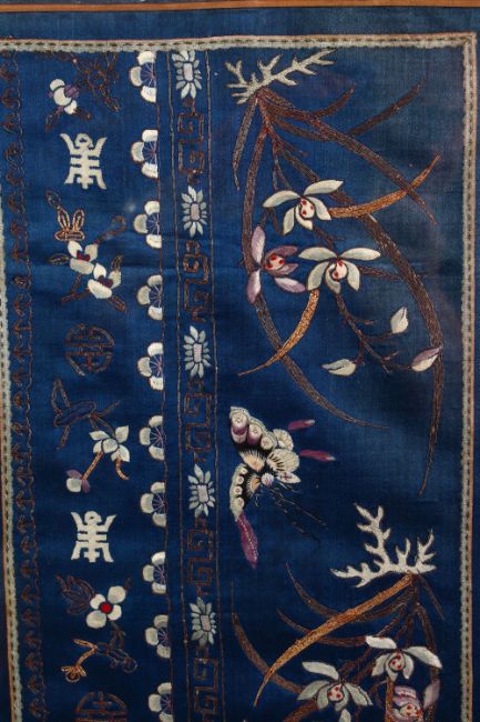 TWO CHINESE EMBROIDERED SILK FRAMED PICTURES, the larger depicting floral decoration with butterflies and symbols, 70cm x 34cm, the smaller depicting embroidered floral display, framed 62cm x 22cm.