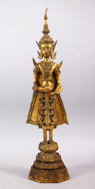 A GOOD 18TH CENTURY GILT BRONZE FIGURE OF BUDDHA / DEITY, in a standing position holding a bowl, stood upon a moulded pedestal, gilded with traces of red lacquer, 51cm high x 13cm wide.