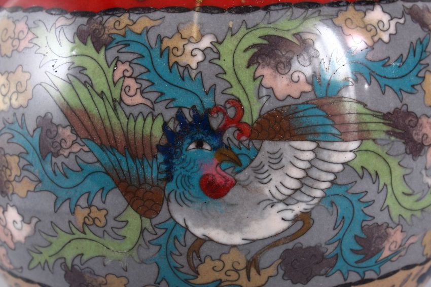 A JAPANESE MEIJI PERIOD CLOISONNE GLOBULAR TRIPOD KORO, decorated with phoenix amongst clouds with native floral borders, 19cm high x 20cm wide.