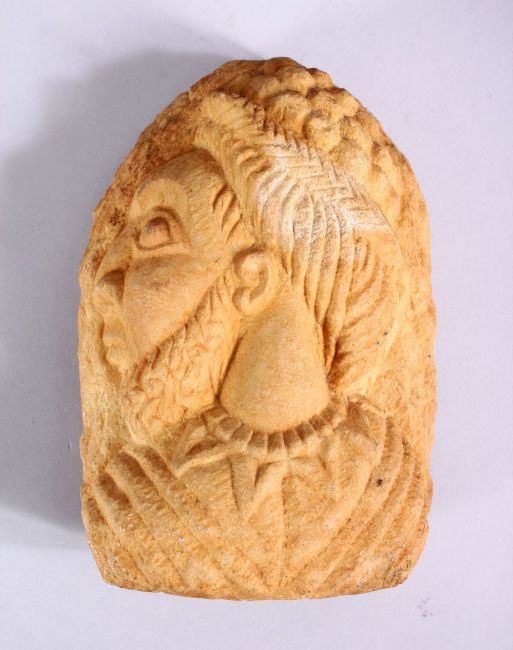 A GOOD MIDDLE EASTERN CARVED STONE HEAD, 16.5cm.