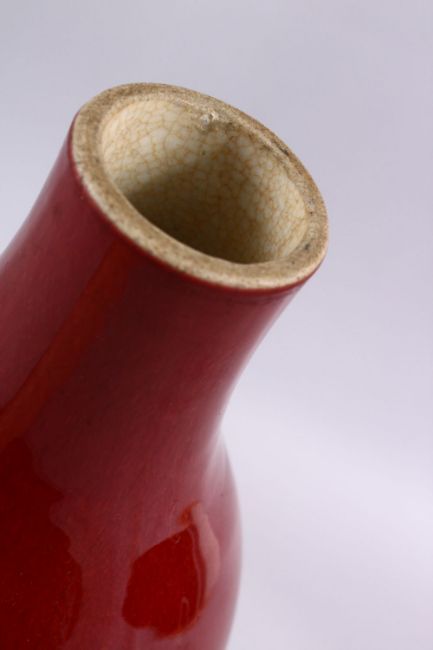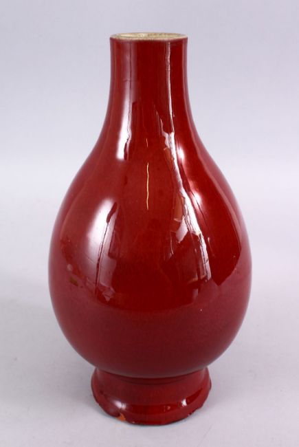 AN 18TH / 19TH CENTURY CHINESE SANG DE BOEUF PORCELAIN BOTTLE VASE, top cut, 29cm