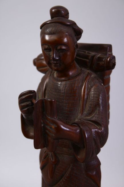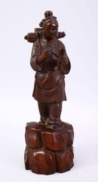 A JAPANESE MEIJI PERIOD CARVED WOODEN OKIMONO OF A TRAVELLING BOY, the boy wearing his back pack and carrying his implements, 31.5cm high.