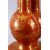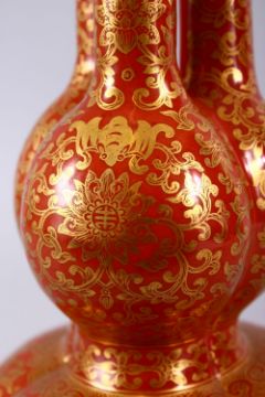 A FINE CHINESE CORAL GROUND TULIP SHAPED PORCELAIN VASE, the body of the tulip / gourd shaped vase with gilt decoration of ruyi borders, formal scroll and flora and swastika motif, the inner neck an base with turquoise ground, and bearing a six character mark, possibly 20th century. 26cm high.