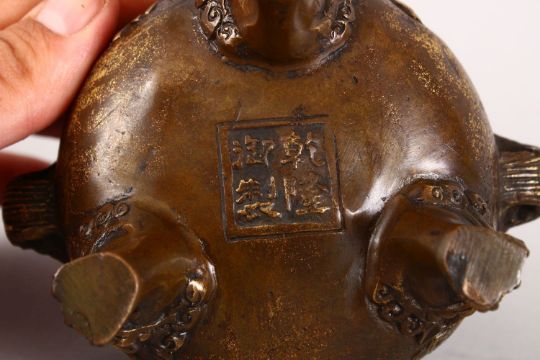 A GOOD 19TH / 20TH CENTURY CHINESE BRONZE TWIN HANDLE CENSER, the censer with twin lion dog head handles, the side decorated with calligraphy and Buddhist objects, stood upon three mask and claw feet, the base with a four character mark, 11cm high x 12cm wide.