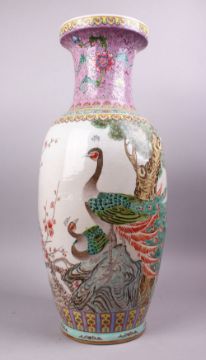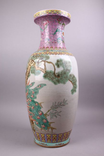 A LARGE CHINESE FAMILLE ROSE PORCELAIN PEACOCK VASE, with decoration of peacocks in landscapes amongst calligraphy, with ruyi borders, the base with a worn iron red 6 character mark, 60cm high.