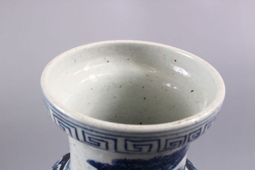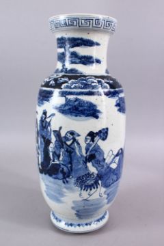 AN 18TH / 19TH CENTURY CHINESE BLUE & WHITE PORCELAIN VASE, decorated with scenes of seated immortal figures in a landscape, mark to base, 39cm.