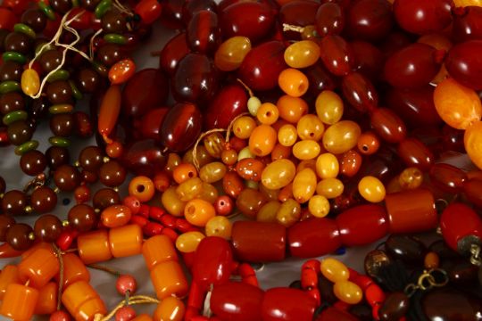A LARGE MIXED LOT OF CHINESE QING DYNASTY CARVED CHERRY AMBER , CORAL, BAKELITE , POSSIBLY AMBER BEADS - NECKLACE - ROSARY BEADS, A heavy bag of mixed beads from cherry amber, Bakelite, coral and possibly some amber, just over 1900gms.