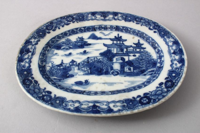 A GOOD 18TH CENTURY CHINESE QIANLONG BLUE & WHITE PORCELAIN BUTTER DISH & COVER & STAND, The body of the three pieces each displaying a typical native landscape view, 8.5cm high x 16.5cm wide x 14cm deep.