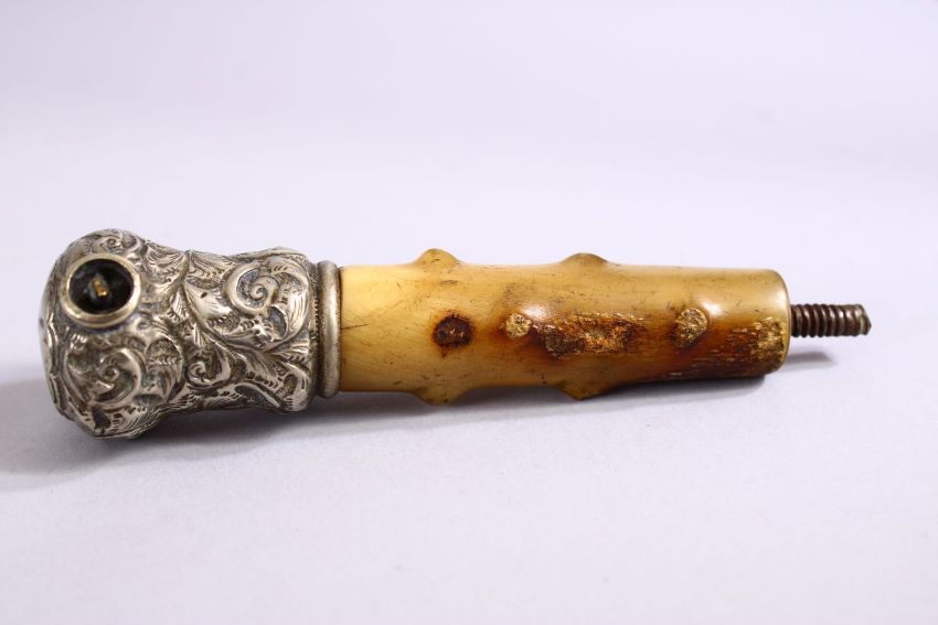 A 19TH CENTURY RHINOCEROS HORN & SILVER PARASOL HANDLE, 11CM