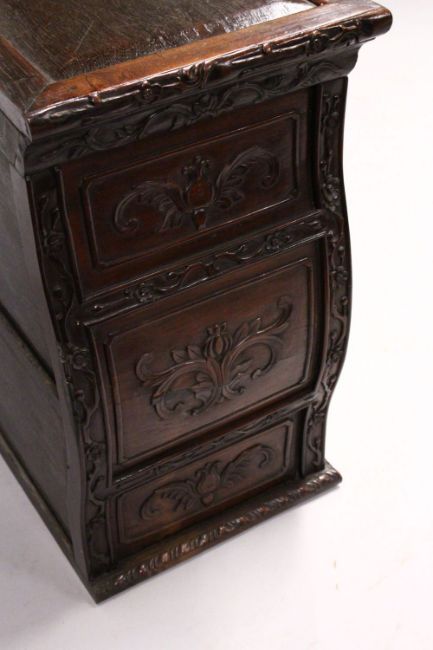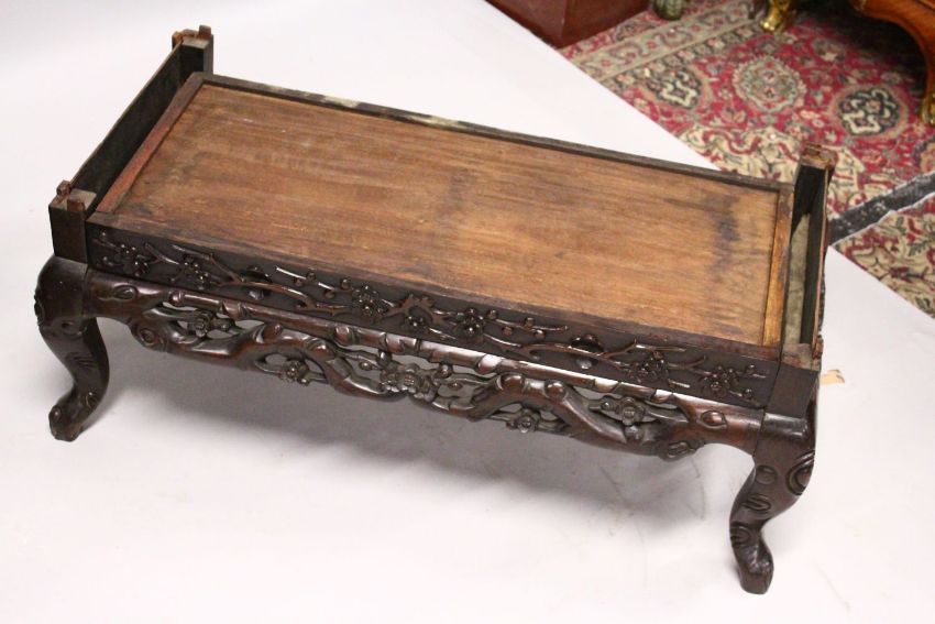 A GOOD 19TH CENTURY CHINESE CARVED HARDWOOD / HONGMU CABINET ON STAND, the cabinet with an opening door revealing a shelf, the base with a draw carved with flora, the cabinet with carved decoration to all sides except the rear depicting dragons and figures in landscapes.