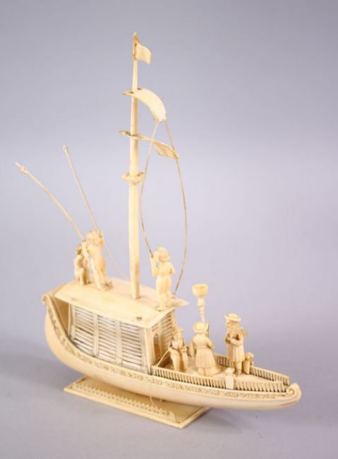 A FINELY CARVED 19TH CENTURY INDIAN IVORY BOAT WITH FISHERMEN, with fine strands of sails, six figures, 19cm wide x 23cm high.