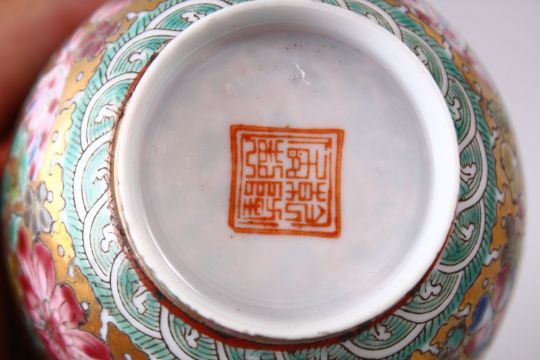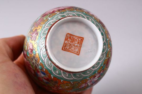 A GOOD CHINESE REPUBLIC STYLE PORCELAIN EGGSHELL CUP, decorated upon a gilt ground with dragons and flora, base with a four character mark, with fitted box, 8cm.