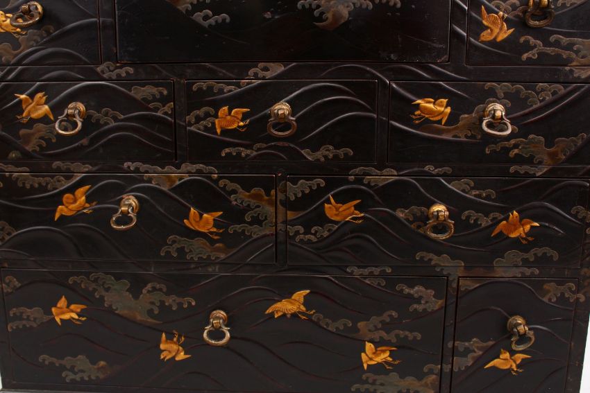 A GOOD JAPANESE MEIJI PERIOD LACQUER CABINET / BOX, The body decorated with raised wave design and gilt birds, the top with koro section, with 9 drawers, 34cm x 37cm.