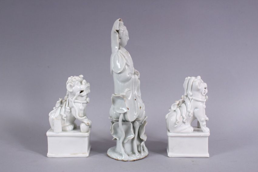A MIXED LOT OF CHINESE BLANC DE CHINE PORCELAIN ITEMS, comprising one figure of guanyin seated amongst lotus, 23cm, and a pair of lion dog incense stick holders 13cm hih.