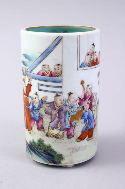 A GOOD CHINESE REPUBLIC STYLE FAMILLE ROSE PORCELAIN BRUSH WASH, decorated with scenes of figures in a landscape celebrating, the base with an iron red mark, 12cm high x 7cm