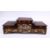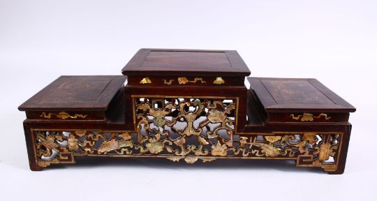 A FINE 19TH CENTURY CHINESE THREE TIER CARVED HARDWOOD & MOTHER OF PEARL STAND, the carved panels inlaid with mother of pearl to depict Buddhistic symbols and formal scrolling vine, 44cm wide x 16cm deep, the tops 16cm square & 16cm x 12cm