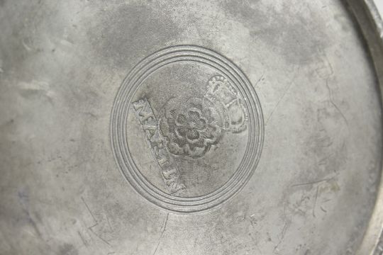 AN EARLY PEWTER LIDDED JUG, stamped MARTIN.