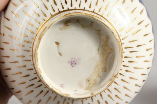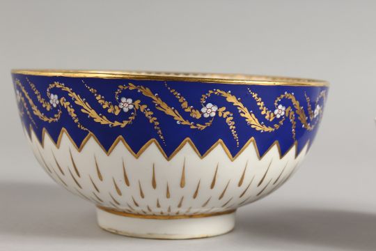 A DERBY BOWL painted with entwined floral swags above three rose sprays, blue and rare incised 'N' and a Derby puce marked bowl with tear drop gliding under a blue and white enamel floral border.