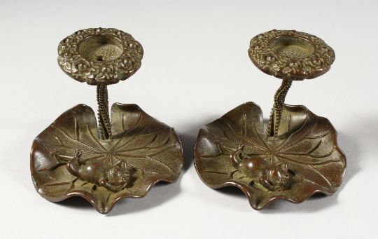 A SMALL PAIR OF BRONZE CANDLESTICKS, modelled as frogs on lily pads.
