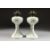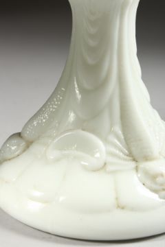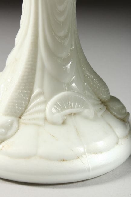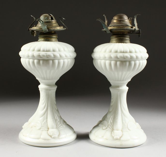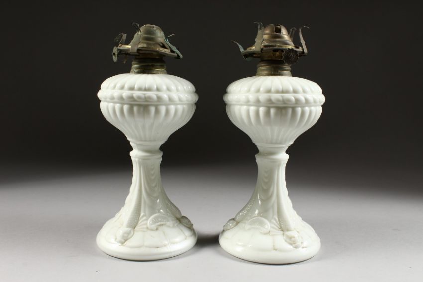 A PAIR OF WHITE OPALINE OIL LAMPS with dolphin supports on circular bases.