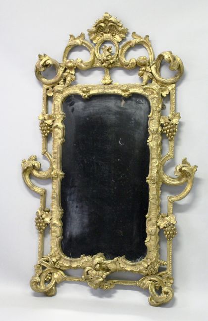 A VERY GOOD 18TH CENTURY GILT FRAME PIER MIRROR, with carved, gesso and gilded pierced frame with floral, grape & vine and "C" scroll decoration.