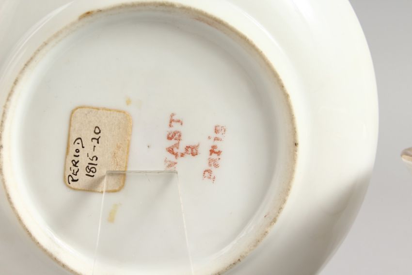 AN EARLY 19TH CENTURY BREAKFAST CUP AND SAUCER with sprays of flowers and gold ribbons, printed with Nast a Paris.