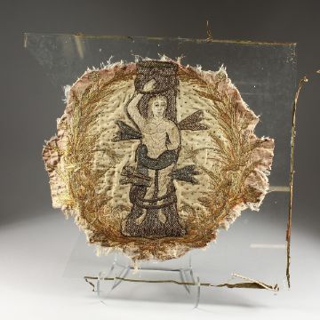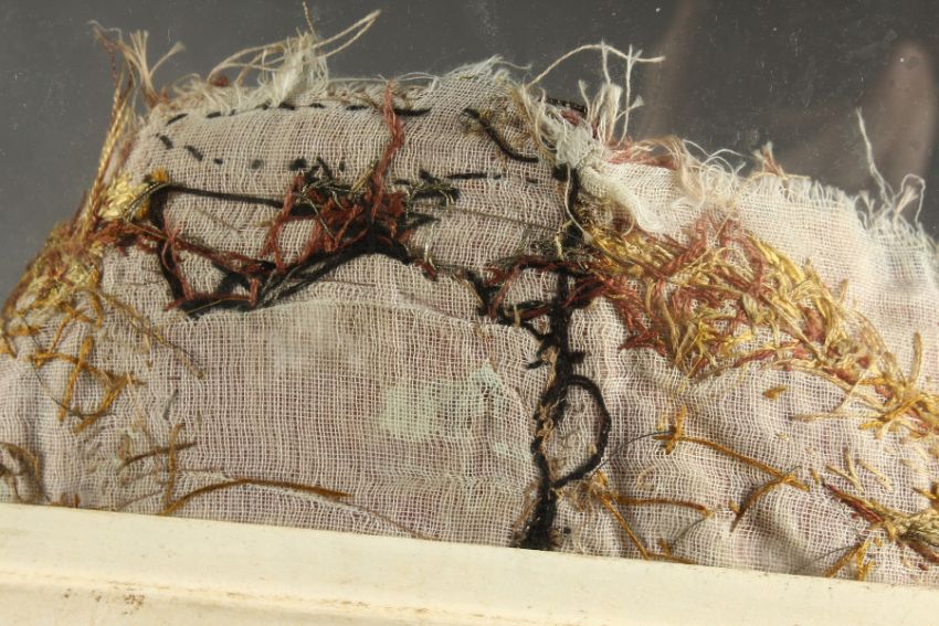 A 17TH CENTURY STUMPWORK TYPE TEXTILE FRAGMENT of ADAM.