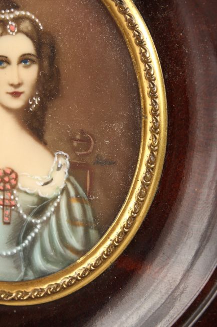 AN OVAL PORTRAIT MINIATURE OF A YOUNG LADY in a wooden frame.