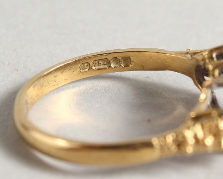 AN 18CT GOLD RUBY AND DIAMOND TRIPLE FLOWER HEAD RING.