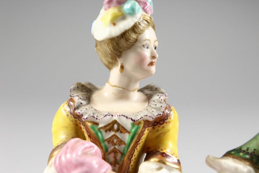 A RARE PAIR OF ANTIQUE MINTON CANDLE SNUFFERS of Mrs Malaprop and Lady Teazle.