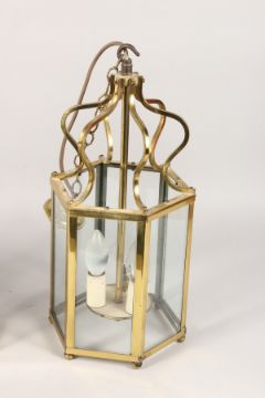 A PAIR OF BRASS HEXAGONAL SHAPED HALL LANTERNS.