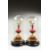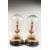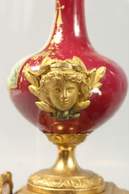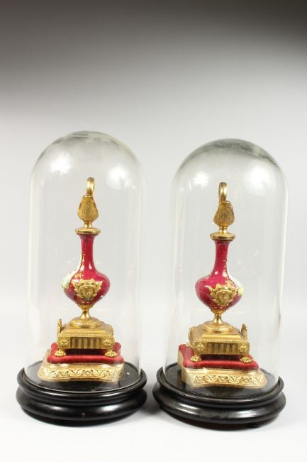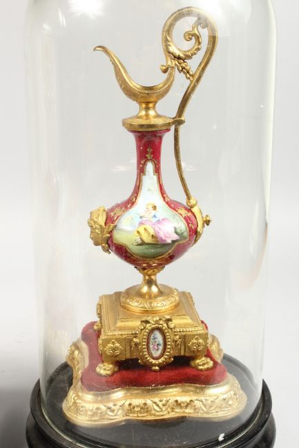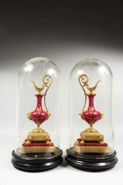 A MIRROR PAIR OF 20TH CENTURY CONTINENTAL PORCELAIN AND ORMOLU EWERS, each painted with a panel depicting a seated figure, on giltwood stands, housed under a pair of glass domes, with ebonised wood stands.