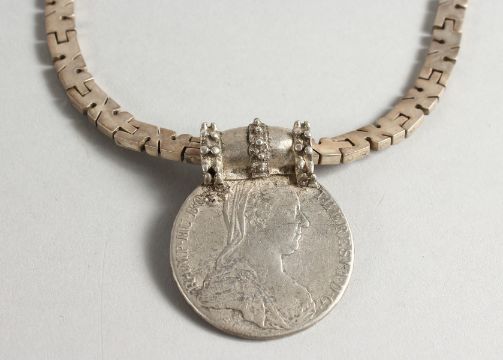 A GOOD HEAVY SILVER CHAIN with SILVER THERESIA.