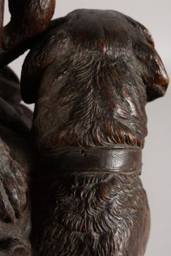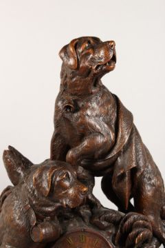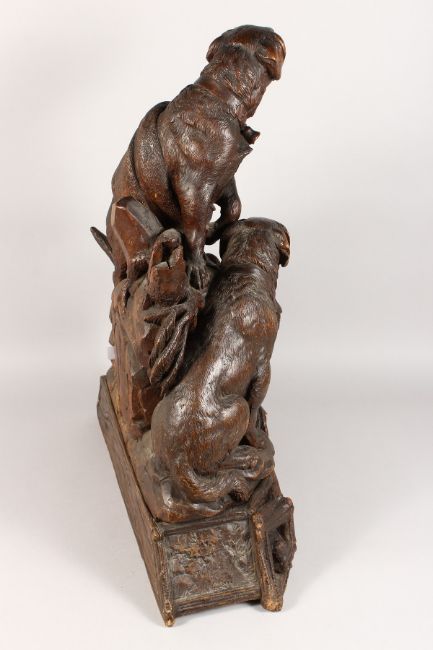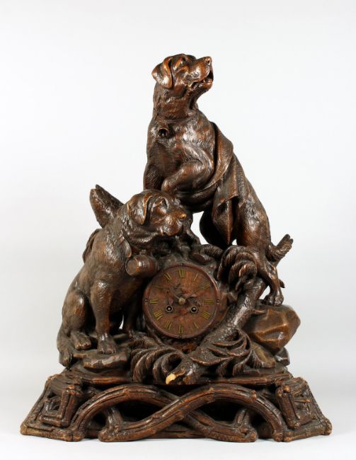 A VERY GOOD ANTIQUE BLACK FOREST CLOCK CARVED WITH TWO SAINT BERNARD DOGS, one with a bell around his neck and a blanket across its back, the other a barrel, the five inch dial striking on a single bell with gilt Roman numerals, the dogs standing on a rustic base.