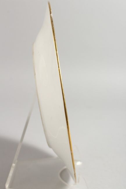 AN ENGLISH DECORATED PARIS PORCELAIN PLATE painted with a winged child in a cloud, seated on a basket of flowers beside a pair of billing doves, probably painted in LOndon by Thomas Baxter.