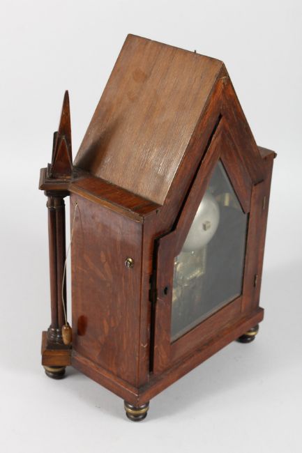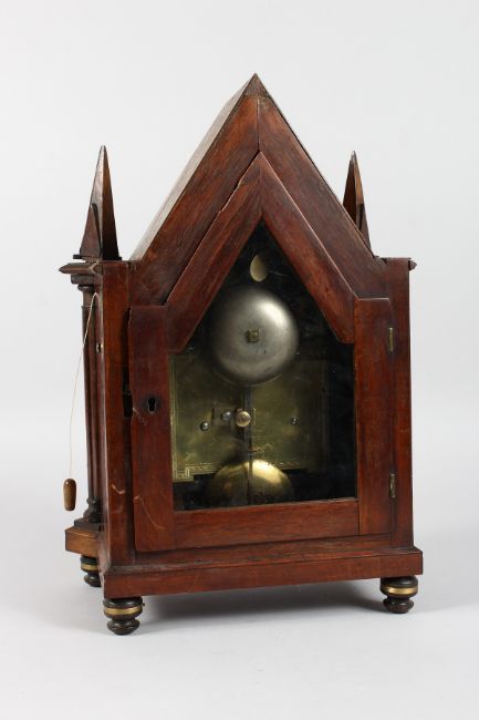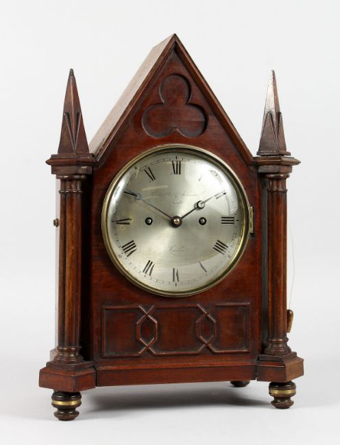 A REGENCY MAHOGANY GOTHIC DESIGN BRACKET CLOCK by GRIMALDE & JOHNSON, STRAND, with silver dial and eight-day movement, striking on a single bell with pull action.