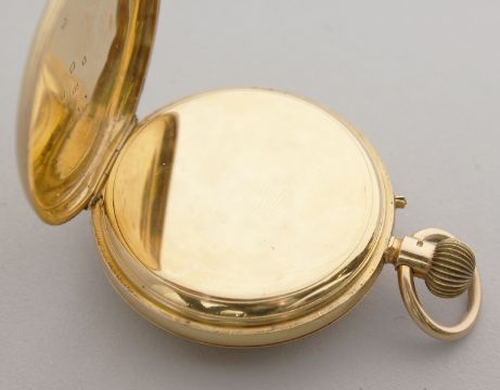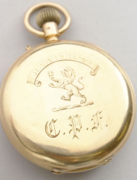 with blue Roman numerals and engraved crest.