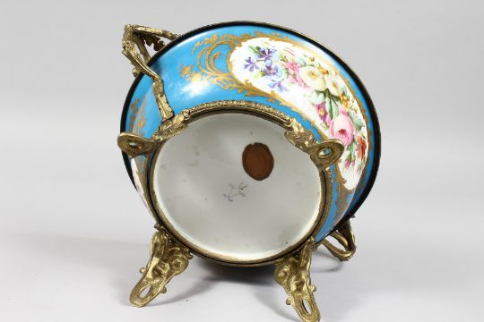 A VERY GOOD SEVRES PORCELAIN AND ORMOLU CIRCULAR PEDESTAL BOWL, painted with garlands of flowers with blue body on an ormolu frame.
