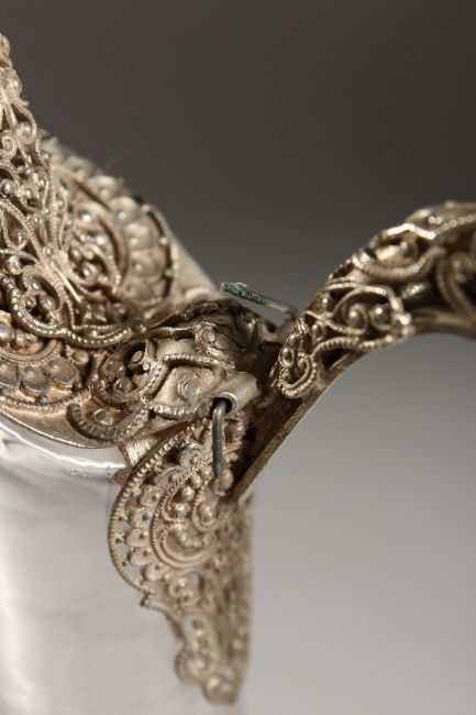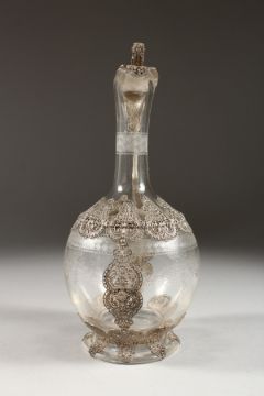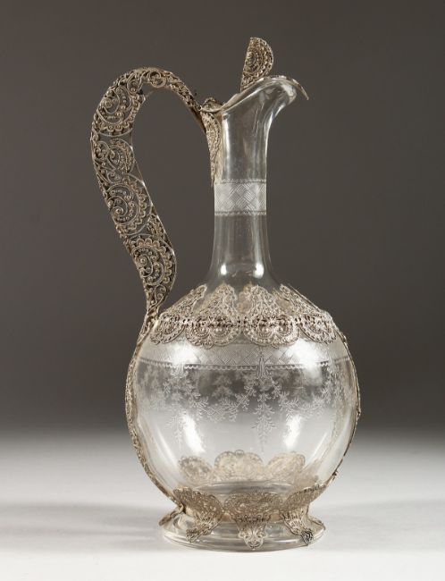 A SUPERB FILIGREE SILVER AND ETCHED GLASS CLARET JUG.