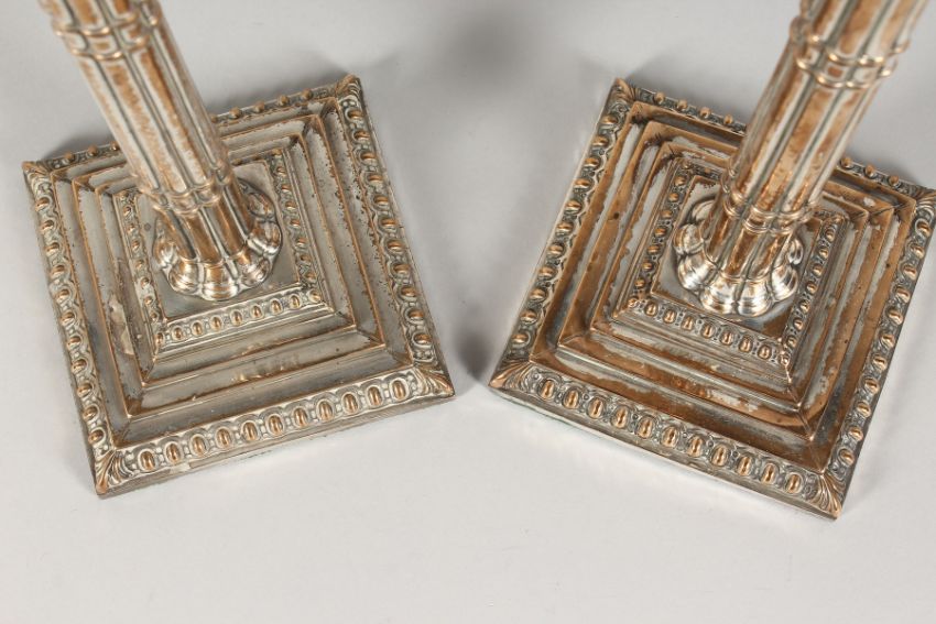 A PAIR OF ADAM DESIGN PLATE CANDLESTICKS with fluted stems, on shaped bases.