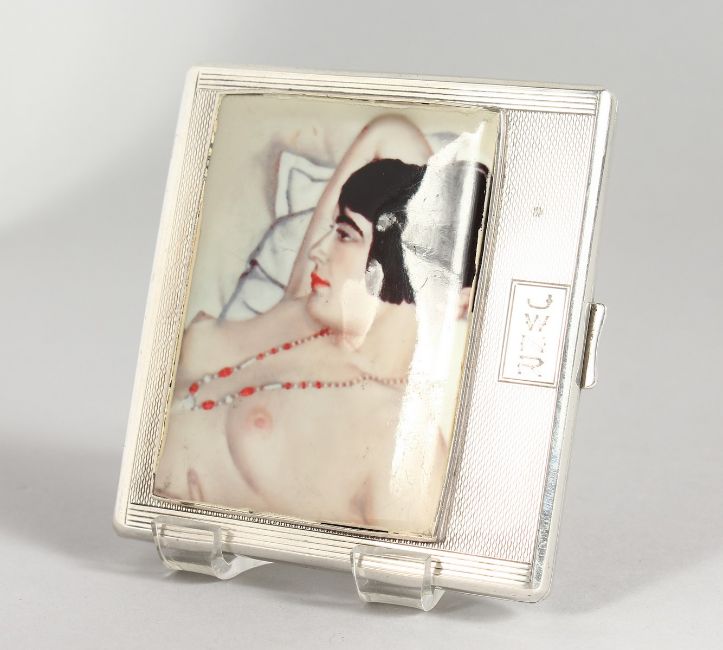 A SILVER CIGARETTE CASE, later decorated with a female nude.