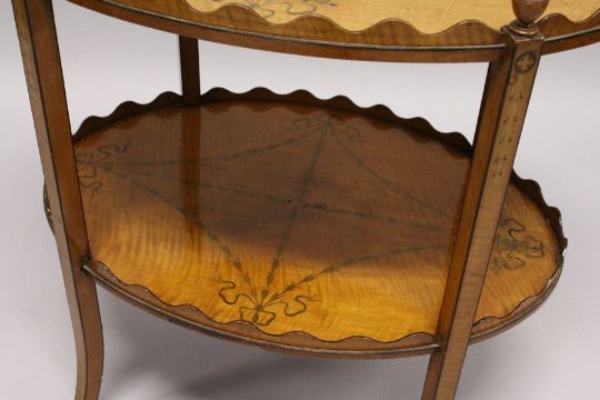A GOOD SHERATON REVIVAL SATINWOOD AND MARQUETRY TWO TIER OVAL ETAGERE, the galleried top and undertier inlaid with ribbons and harebells, united by four slender square shaped legs.
