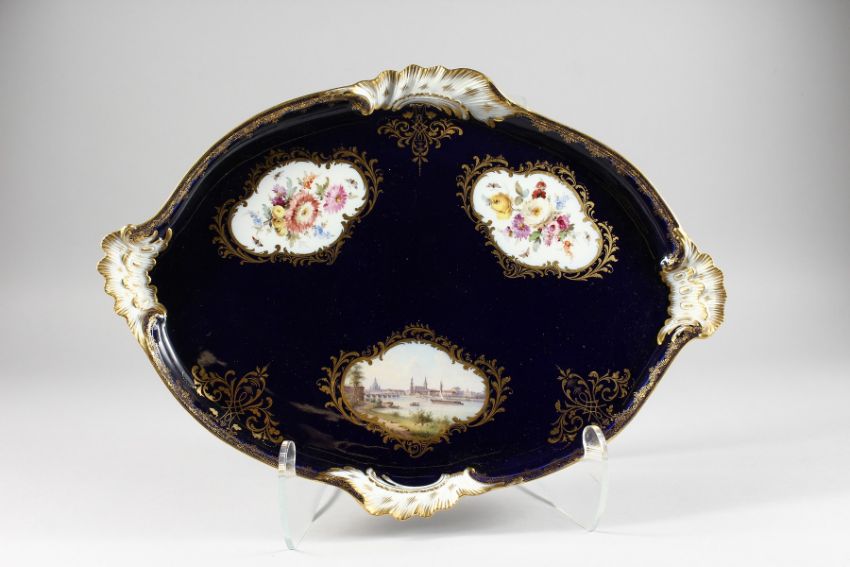 A SUPERB MEISSEN OVAL SHAPED TRAY, rich blue ground painted with panels of flowers and Dresden.