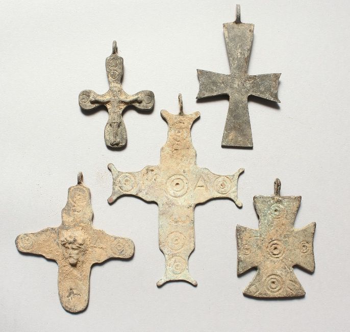 FIVE MEDIUM ROMAN METAL CROSSES.