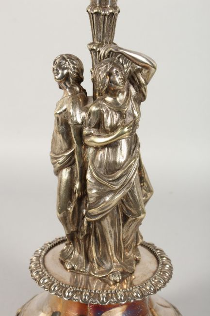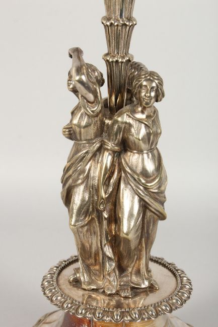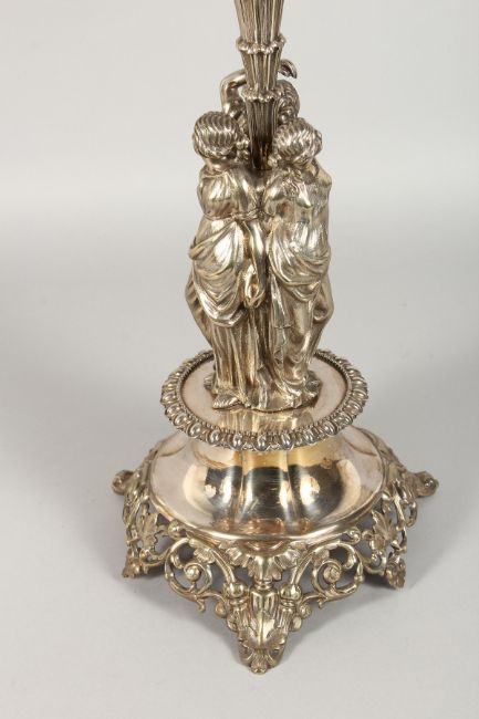 A LARGE VICTORIAN PLATE TABLE CENTREPIECE, with circular cut glass bowl, supported on three curving branches, palm tree and three roses, on a circular panel base.