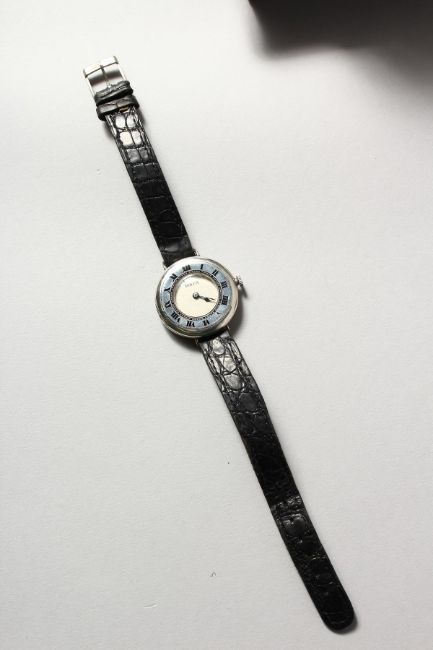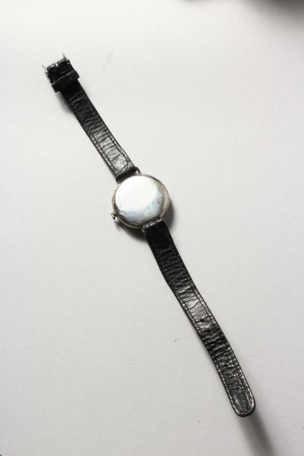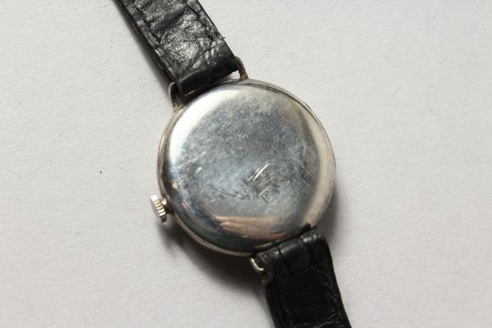 A LADIES SILVER ROLEX with Roman numerals and leather strap.