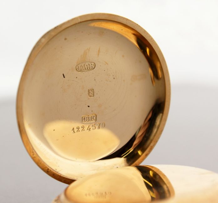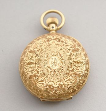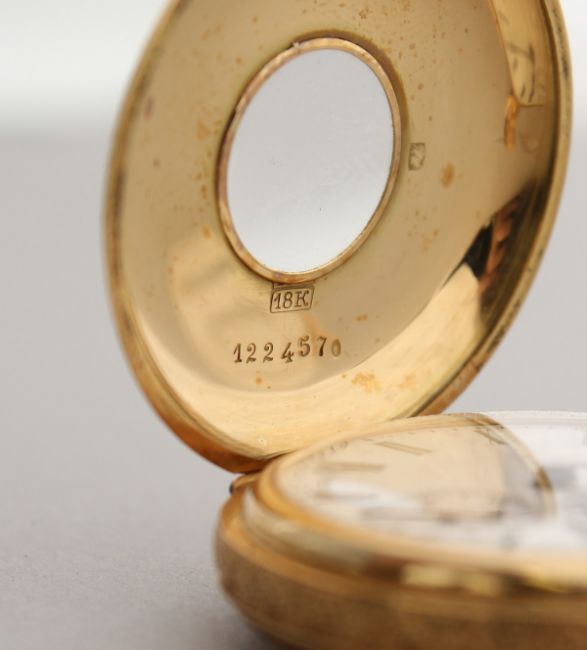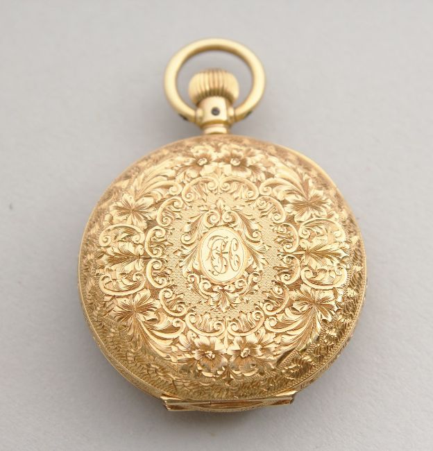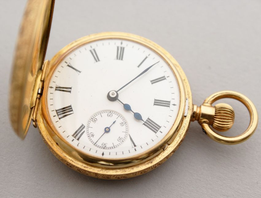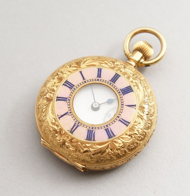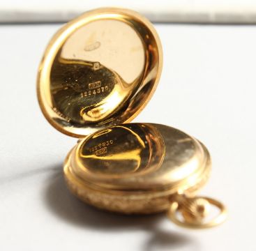 A LADIES' 18CT GOLD HALF HUNTER POCKET WATCH with engraved case and blue Roman numerals.